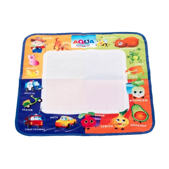 Wyraź się artystycznie w kreatywnej zabawie! Mata do malowania podzielona jest na 4 pola kolorystyczne, co umożliwia tworzenie barwnych rysunków. Jej krawędź ozdobiona jest wesołymi, obrazkami oraz ich nazwami, dzięki czemu dzieci mogą poznawać nowe wyrazy. W zestawie znajduje się specjalny mazak, który, po napełnieniu wodą, będzie malował po macie. Kiedy mata wyschnie, obrazek zniknie, jak zaczarowany!