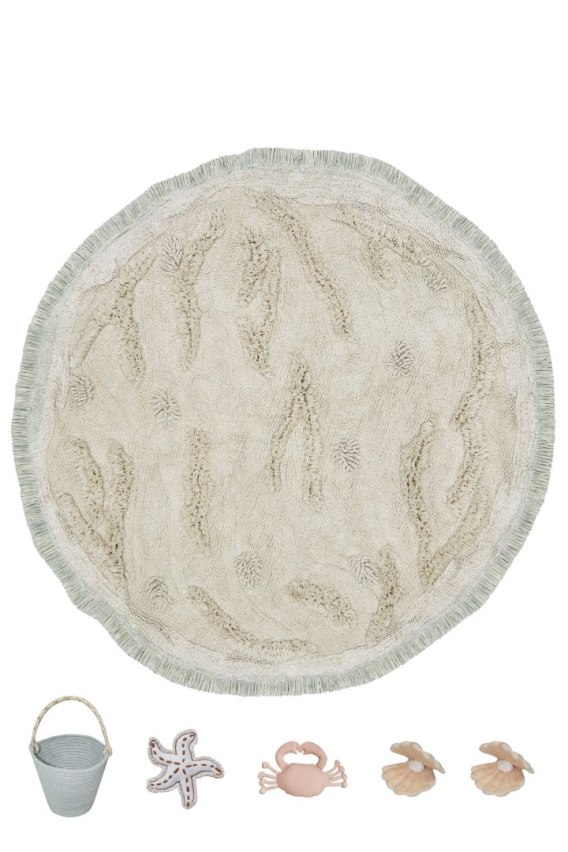 Łącząc krótkie i średniej wysokości runo w nieregularny wzór, dywanik Island przywodzi na myśl miękkie wydmy piaszczystej plaży. Otoczony krótkimi frędzlami w naturalnym i niebieskim kolorze szałwii reprezentującym brzeg oceanu. Dywanik jest dostarczany z zestawem akcesoriów do zabawy: plecionym koszykiem z niebieskiego sznurka szałwiowego, miękkim krabem, ręcznie haftowaną rozgwiazdą i dwiema muszlami z perłami.
