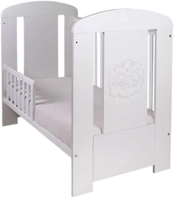 Łóżeczko dziecięce TAPCZANIK MIŚ BIAŁY wykonane z laminowanej płyty wiórowej i drewna sosnowego, posiadające 3 stopnie regulacji położenia materaca. Grawerowana grafika malowana brokatem.