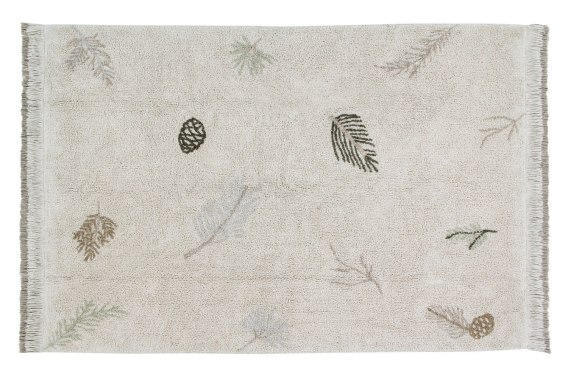 Jak zbiór małych skarbów na leśnym spacerze: w tym dywanie pojawiają się drobne gałązki, liście, zioła lub szyszki, zakończone dwoma rzędami frędzli zachodzących na brzegi, w delikatnych kontrastowych odcieniach brązu i lnu. Dywan Pine Forest wzorowany na dywanie Botanic Plants (poprzedni projekt), w którym kolorowy tropikalny nadruk ustępuje teraz bardziej stonowanej palecie inspirowanej śródziemnomorską roślinnością. Dzięki temu dywanowi natura może wymknąć się z pokoju dziecięcego i wejść również do salonu.