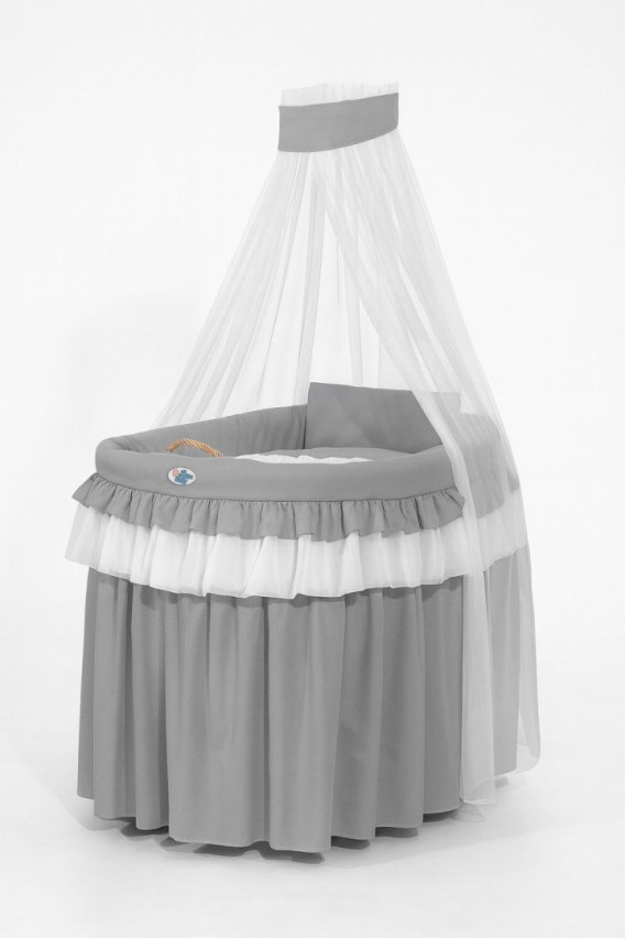 Piękny, duży ręcznie pleciony wiklinowy kosz z oryginalnym drewnianym podwoziem umożliwiającym łatwe przestawianie kosza. Naturalny kolor wikliny i drewna. Obszycie kosza uszyte z najwyższej jakości tkaniny bawełnianej posiadającej certyfikat Oekotex. Baldachim z białego lekkiego tiulu. Każdy element jest rozbieralny do prania.