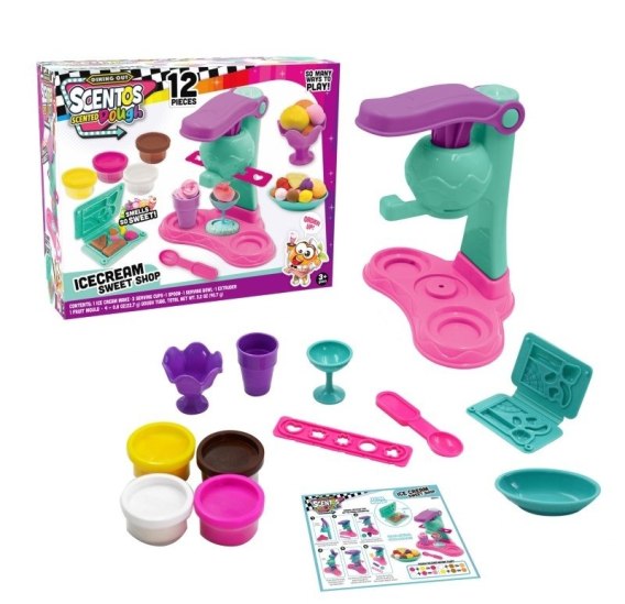- w zestawie 12 elementów: zabawkowa maszynka do tworzenia ciastolinowych lodów, 3 zabawkowe naczynia do serwowania, 1 zabawkowa łyżka, 1 zabawkowa miseczka, zabawkowa wytłaczarka, foremka z kształtami owoców i 4 kubeczki z pachnącą ciastoliną (w różnych kolorach);