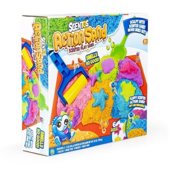 - w zestawie: pachnący piasek kinetyczny w pięciu kolorach, 6 plastikowych foremek, 1 zabawkowa łyżka, 1 zabawkowy wałek i 1 mata;