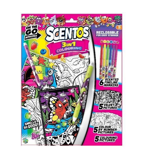 w zestawie: 15 obrazków do pokolorowania (do malowania po numerach; wymiary każdego z obrazków - 20,5 x 25 cm), zapachowe długopisy (5 szt., każdy w innym kolorze) i zapachowe kredki ołówkowe (5 szt., każda w innym kolorze); całość zapakowana w wygodną teczkę.