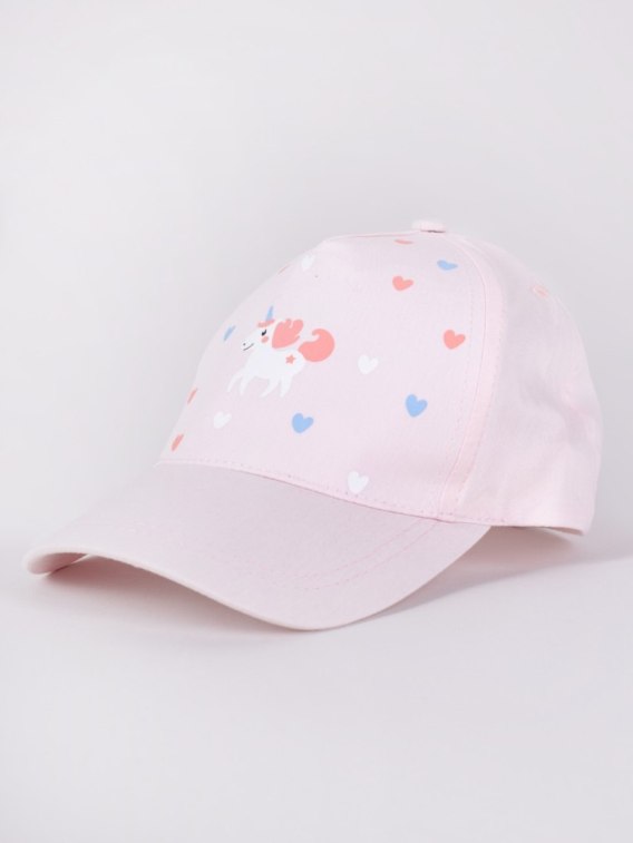 Dziecięca czapka bejsbolówka w kolorze jasno - różowym. O klasycznym kroju, z lekko wygiętym daszkiem. Z przodu motyw jednorożca. Dzięki zapięciu na rzep, model ten daje możliwość indywidualnego regulowania rozmiaru i dostosowania go do obwodu głowy. O prawidłowy przepływ powietrza dbają obszywane otwory wentylacyjne. Daszek zapewni dodatkowy cień i osłoni oczy dziecka przed promieniami słonecznymi.