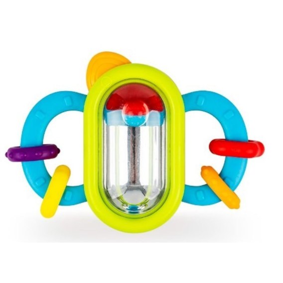 Kompaktowa zabawka, która łączy w sobie gryzak i grzechotkę. Wyposażona jest w dwa miękkie uchwyty z wypustkami, które przyniosą ulgę obolałym dziąsłom ząbkującego malucha. Na uchwytach znajdują się kolorowe kółeczka, które można przesuwać. W środkowej części znajduje się grzechocząca, dwustronna kuleczka, dzięki czemu zabawka wydaje wesoły dźwięk przy potrząsaniu. Niewielki rozmiar grzechotki pozwala korzystać z niej zarówno w domu, jak i w podróży.