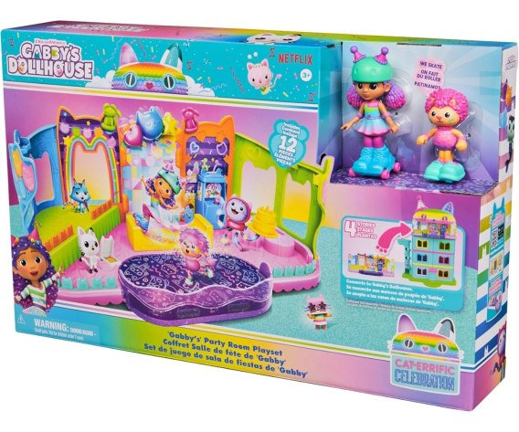 Dołącz do Gabi i Imprezowego Kota Maniusia w kolorowym Pokoju Imprezowym z serialu „Gabby's Dollhouse"! Czeka na was lodowisko, rampa, scena koncertowa, automat do gier i kącik restauracyjny - wszystko, czego potrzeba do świetnej zabawy!