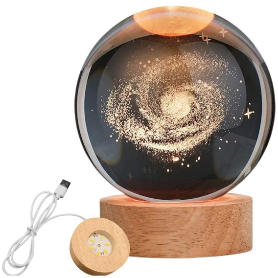 Ta magiczna szklana kula to niepowtarzalny element dekoracyjny i edukacyjny! Dzięki technologii laserowego grawerowania wewnątrz szkła, lampka tworzy hipnotyzującą iluzję 3D przedstawiającą Drogę Mleczną. Umieszczona na drewnianej podstawce i podświetlona diodami LED, kula nadaje każdemu pomieszczeniu niesamowitego klimatu.