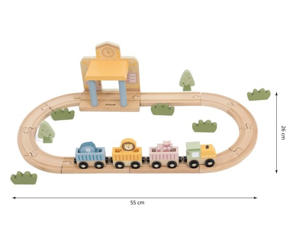 Zawartość zestawu: tory, stacja kolejowa z dźwiękiem, lokomotywa, 3 wagony, figurki zwierząt (lew, słoń, lis), drzewa i krzewy