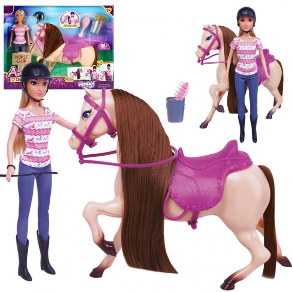 Zanurz się w magiczny świat jeździectwa dzięki niezwykłemu zestawowi od marki Woopie Royal! Ta wspaniała zabawka stworzona została z myślą o dzieciach, które marzą o opiece nad koniem oraz kochają zabawę lalkami. W zestawie znajdziesz nie tylko piękną lalkę, ale również uroczego konika - oboje wyposażeni w długie, gęste włosy, idealne do czesania i stylizacji. Dzięki temu dzieci mają nieograniczone możliwości w tworzeniu unikalnych fryzur, rozwijając przy tym swoją kreatywność i zdolności manualne. Zestaw ten oferuje nie tylko godziny pełne fantazji i zabawy, ale także cenną naukę opieki oraz odpowiedzialności. Lalka ubrana jest w stylowy strój, który dodaje jej uroku, a dołączone akcesoria - takie jak kask, szczotkę czy pojemnik z marchewkami - czynią zabawę jeszcze bardziej realistyczną i interaktywną. To prawdziwa gratka dla małych miłośniczek koni i lalek, które pragną wcielić się w rolę troskliwego opiekuna i jeźdźca.