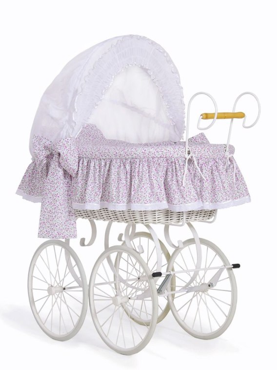 • Wiklinowy kosz Mojżesza Retro ze składaną budką Jasmine - biały + różowa pościel z koronką