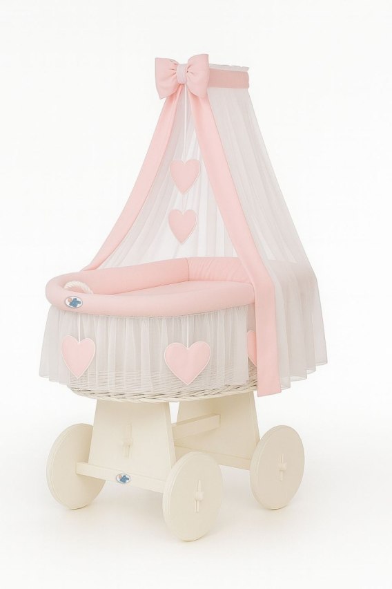 Wiklinowy kosz Mojżesza z baldachimem Amelia - biały + różowa pościel