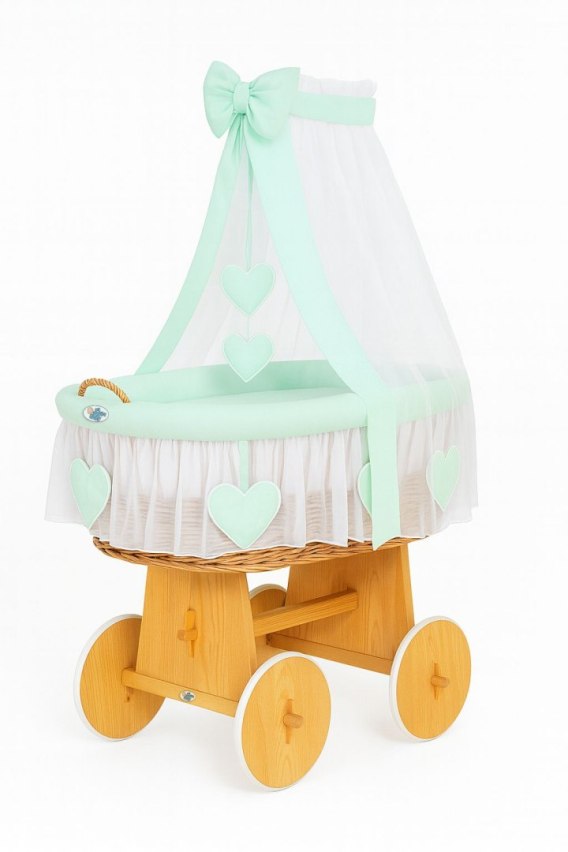 • Wiklinowy kosz Mojżesza z baldachimem Amelia - naturalny + miętowa pościel