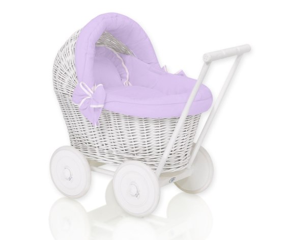 Wiklinowy wózek dla lalek pchacz biały z fioletową pościelką i miękką wyściółką STELLA