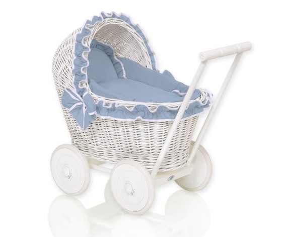Wiklinowy wózek dla lalek pchacz biały z pościelką brudny niebieski i miękką wyściółką CHIARA