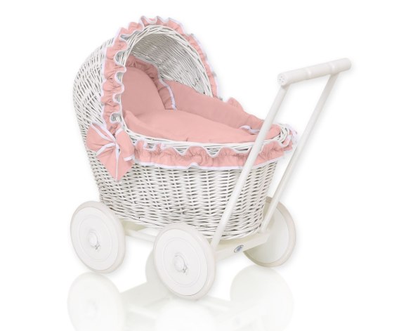 Wiklinowy wózek dla lalek pchacz biały z pościelką brudny róż i miękką wyściółką CHIARA