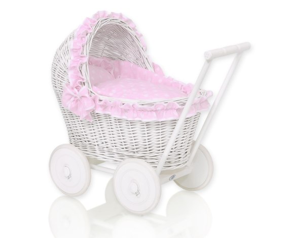 Wiklinowy wózek dla lalek pchacz biały z różową pościelką i miękką wyściółką CHIARA
