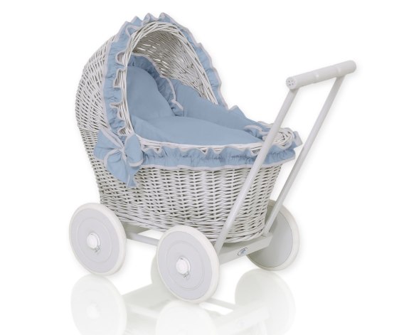 Wiklinowy wózek dla lalek pchacz szary z pościelką i miękką wyściółką brudny niebieski