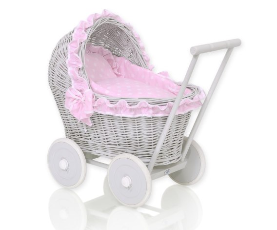 Wiklinowy wózek dla lalek pchacz szary z różową pościelką i miękką wyściółką