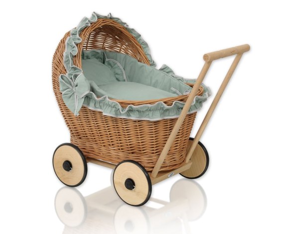 Wiklinowy wózek dla lalek pchacz z szałwiową pościelką i miękką wyściółką CHIARA - naturalny
