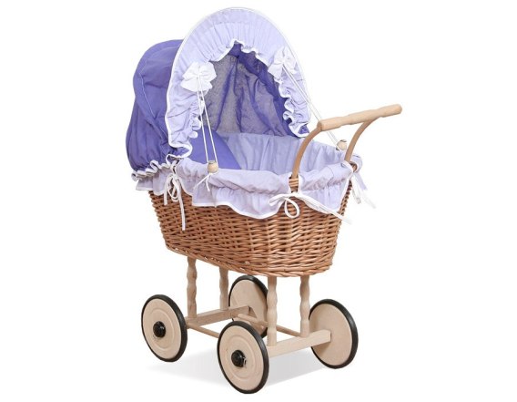 Wiklinowy wózek dla lalek wysoki z fioletową pościelką i wyściółką NATALIA naturalny