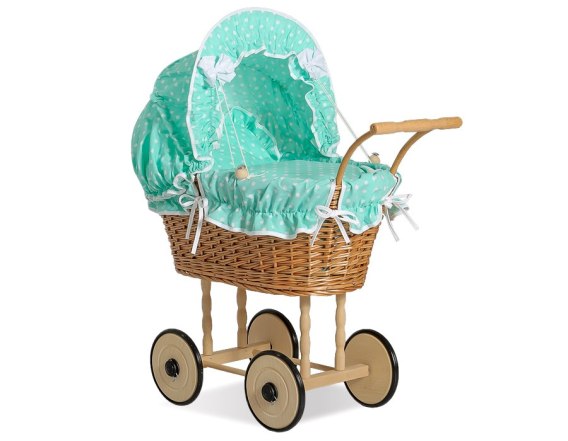 Wiklinowy wózek dla lalek wysoki z miętową pościelką i wyściółką NATALIA naturalny
