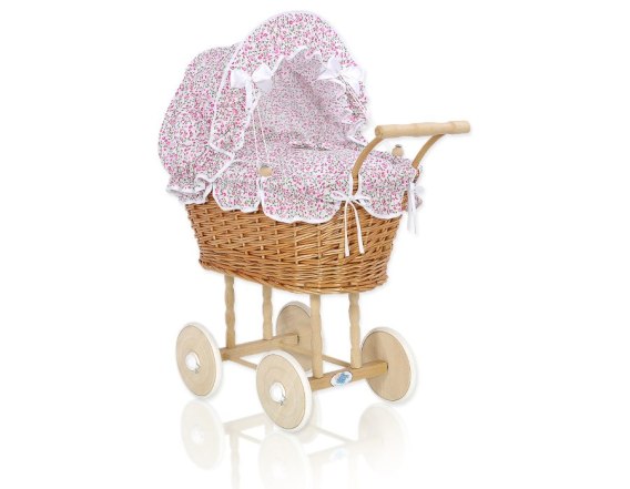 Wiklinowy wózek dla lalek wysoki z różową pościelką i wyściółką- naturalny