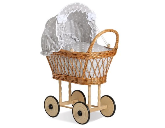 Wiklinowy wózek dla lalek wysoki z szarą pościelką i wyściółką- naturalny